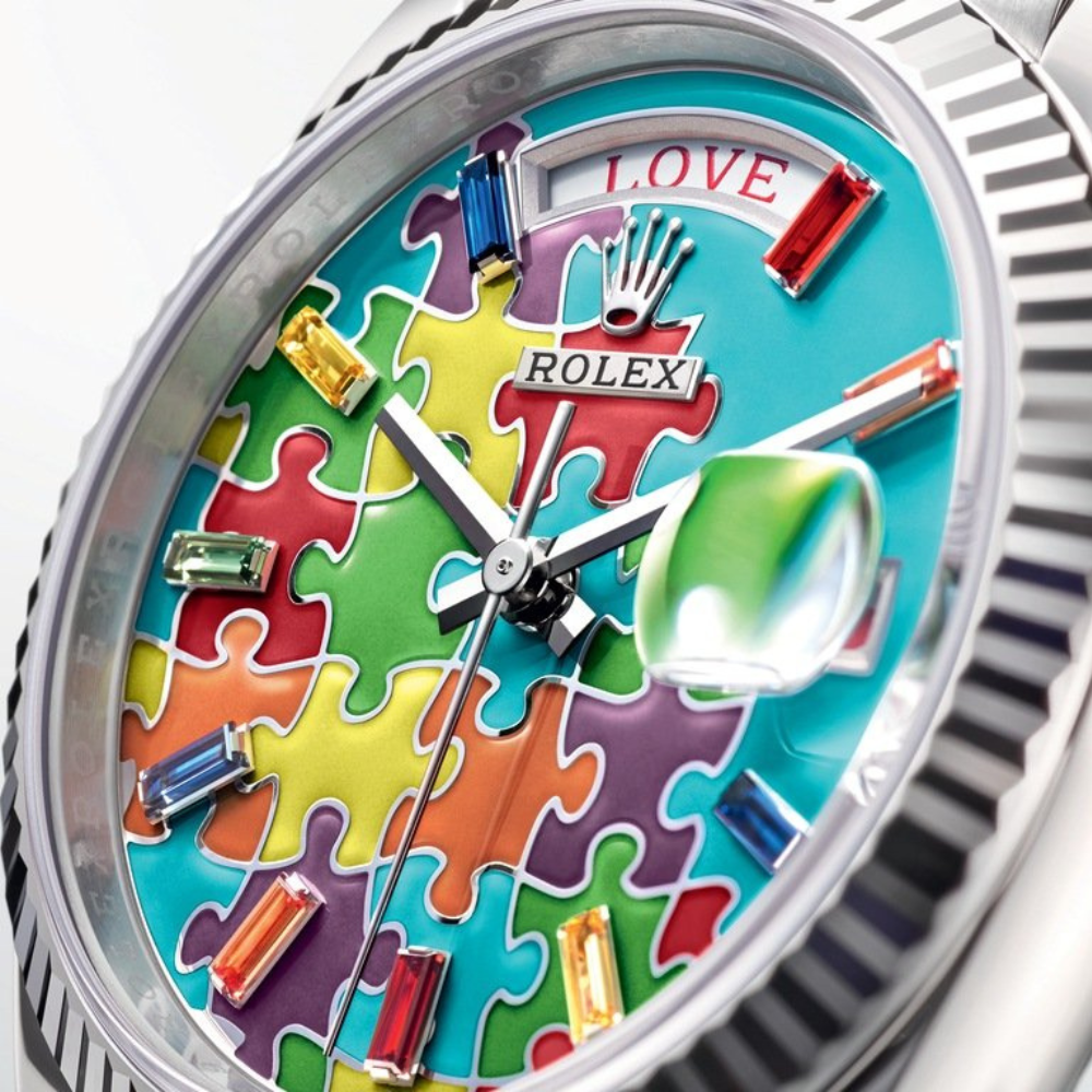 My pick for the best watch of 2023 is the Rolex Day-Date Jigsaw Puzzle dial. The design is bold, light-hearted, and whimsical. The watch is fun and gives a positive vibe with Inspirational words for the day and emojis for the date. The dial is artistic and beautifully crafted with a multicolor jigsaw motif. Also, 10 rainbow baguette-cut sapphire indices which match the jigsaw. Also, typically, a jigsaw puzzle is symbolic of Autism Awareness, which my family and I are touched by.