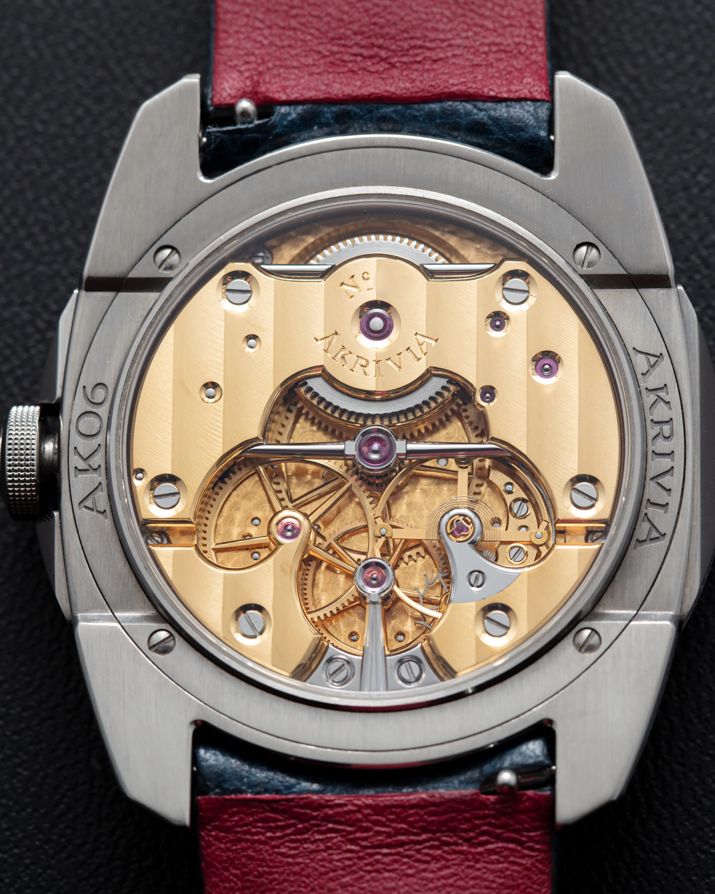 The movement is the aspect of this timepiece that generates the most admiration in the watch community. While dials and cases have varied throughout the life of AkriviA, Rexhep has a very well-defined design language for movements. Movements are often symmetrical with highly visible center-wheels. For a time-only watch, the AK-06 caliber provides tremendous depth with the bridges, then barrel, and finally going train in the central recessed cavern of the movement. Offered in two materials, a yellow-gold gilt and rhodium-plating, the level of finishing is astounding with all the fixings of haute horlogerie – anglage, Côtes de Genève, and deep countersinks with polished screw heads.