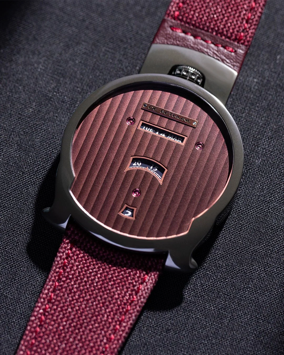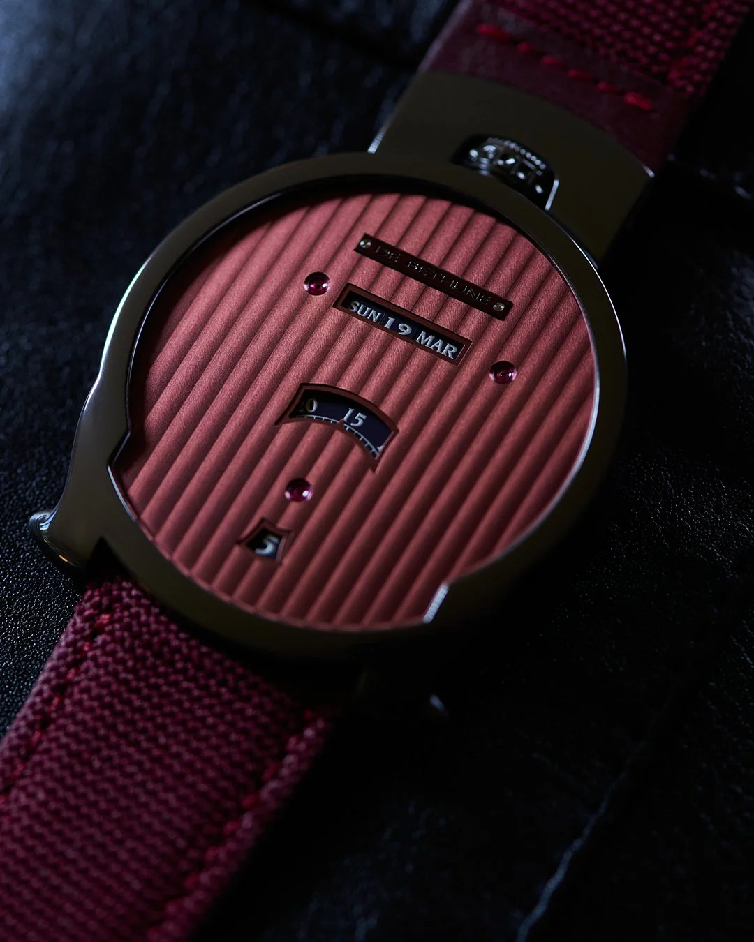The Dream Watch 5 Tourbillon "Season 1" was a masterclass in avant-garde aesthetics and transparency through the case. The DBD “Season 2” continues in the same direction as a bold and contemporary re-interpretation of the brand’s DBD from 2006. Featuring a light anthracite-colored polished zirconium case and a burgundy dial with Côtes de Genève decoration, the day of the week, date, and month are presented linearly through Art-Deco-style apertures at 12 o’clock while jumping hours and scrolling minutes appear opposite each other on the lower half of the dial.