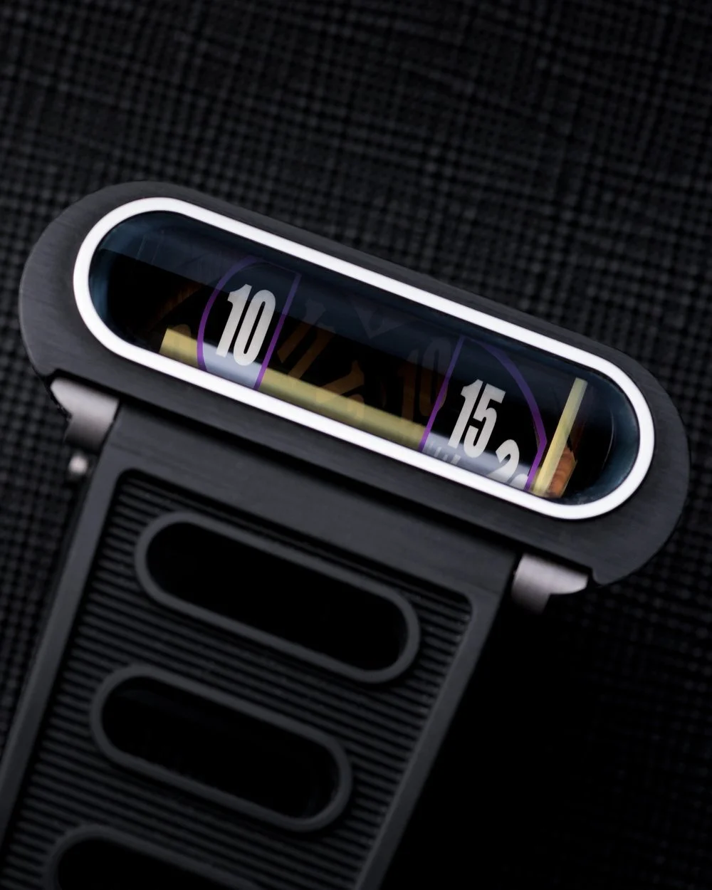 The HM5’s movement is based on Girard-Perregaux's GP3300, a jumping hour movement with significant modifications to meet the needs of the case and unusual display of time. Jumping hour and running minutes discs are mounted horizontally on top of the movement. How does one see the time then as if it were vertical? Behind the sapphire crystal is a wedge-shaped prism that reflects the discs 90 degrees into their upright, legible positions. This is one of the early experiments for MB&F in their ultra-innovative engineering of sapphire crystal, exemplifying the brand’s “Sapphire Vision” timepieces. One notices an additional, slight magnification on the display of time. This is created by an overlaid convex prism that enlarges the discs by roughly 20% and improves legibility at arms length.