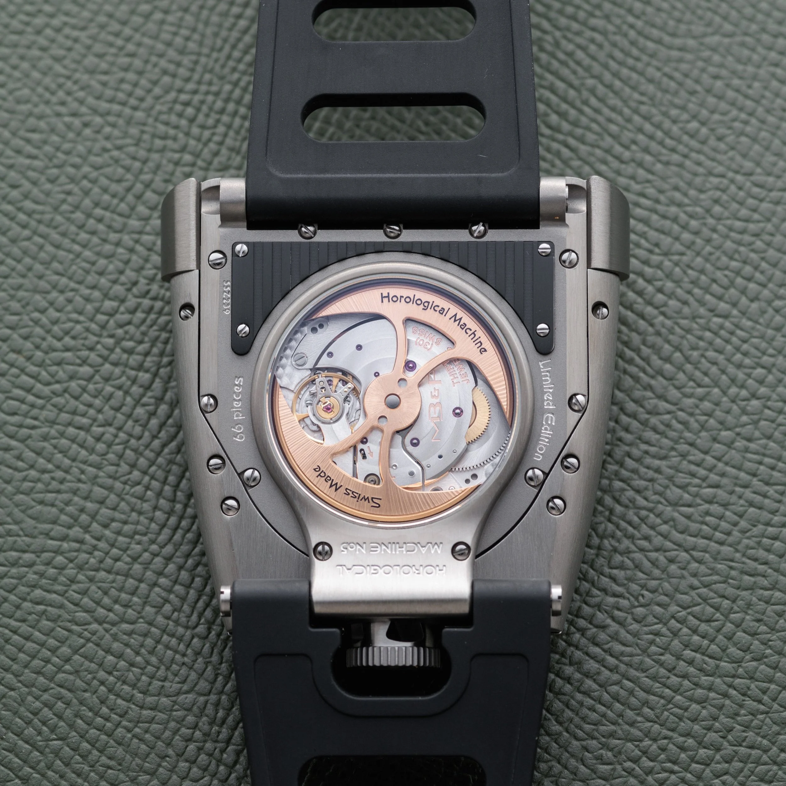 MB&F’s iconic battle ax rotor on full display through the HM5’s caseback .