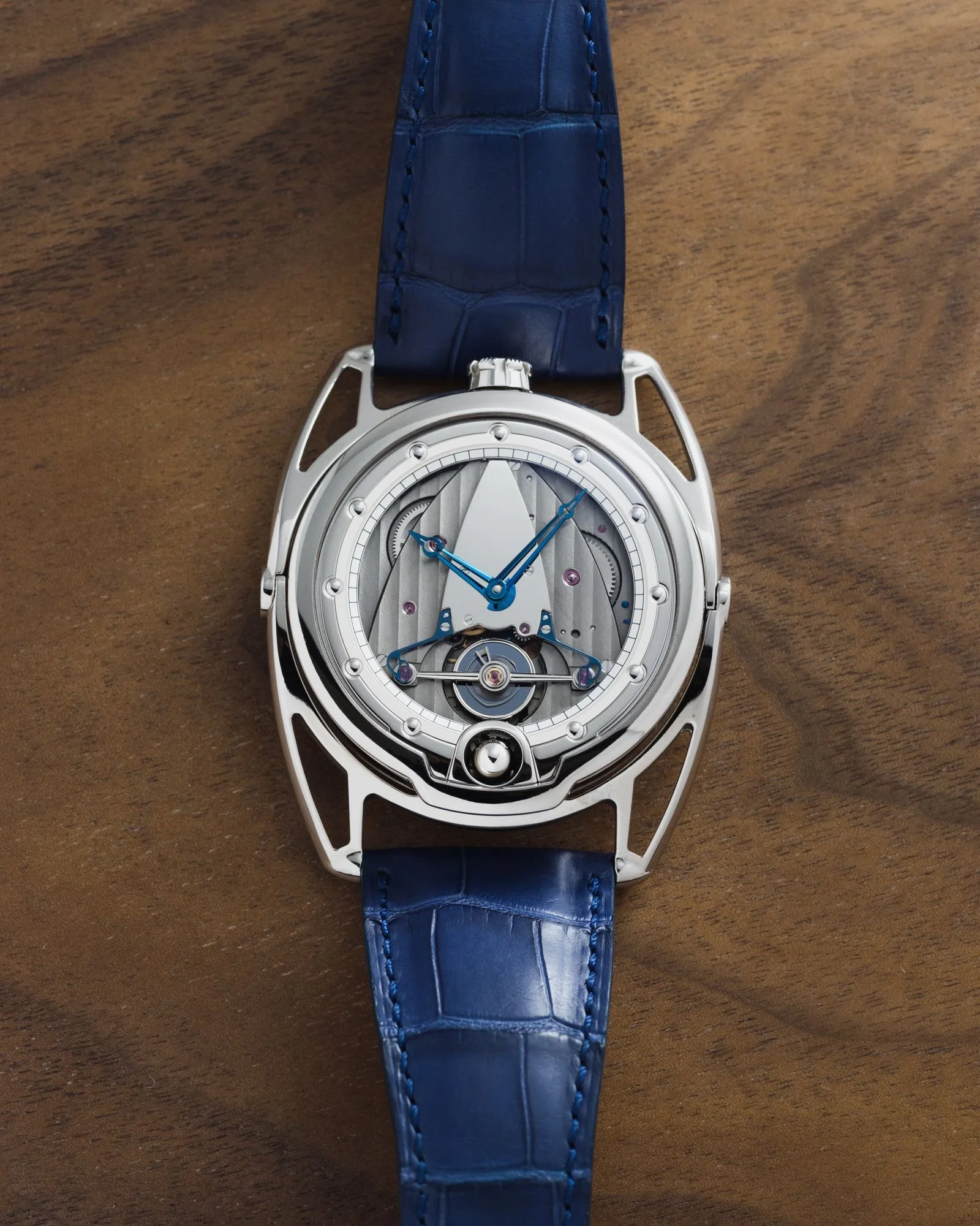 Spherical moon with blued steel, silicon/palladium balance wheel, triple “pare-chute” shock-absorbing system and “floating lugs,” this was an exceptionally avant-garde timepiece, especially for the early 2010’s. At 42.7mm in diameter and 9.3mm in thickness, there was no sacrifice of wearability or legibility with the decision to fully embrace futuristic aesthetics.