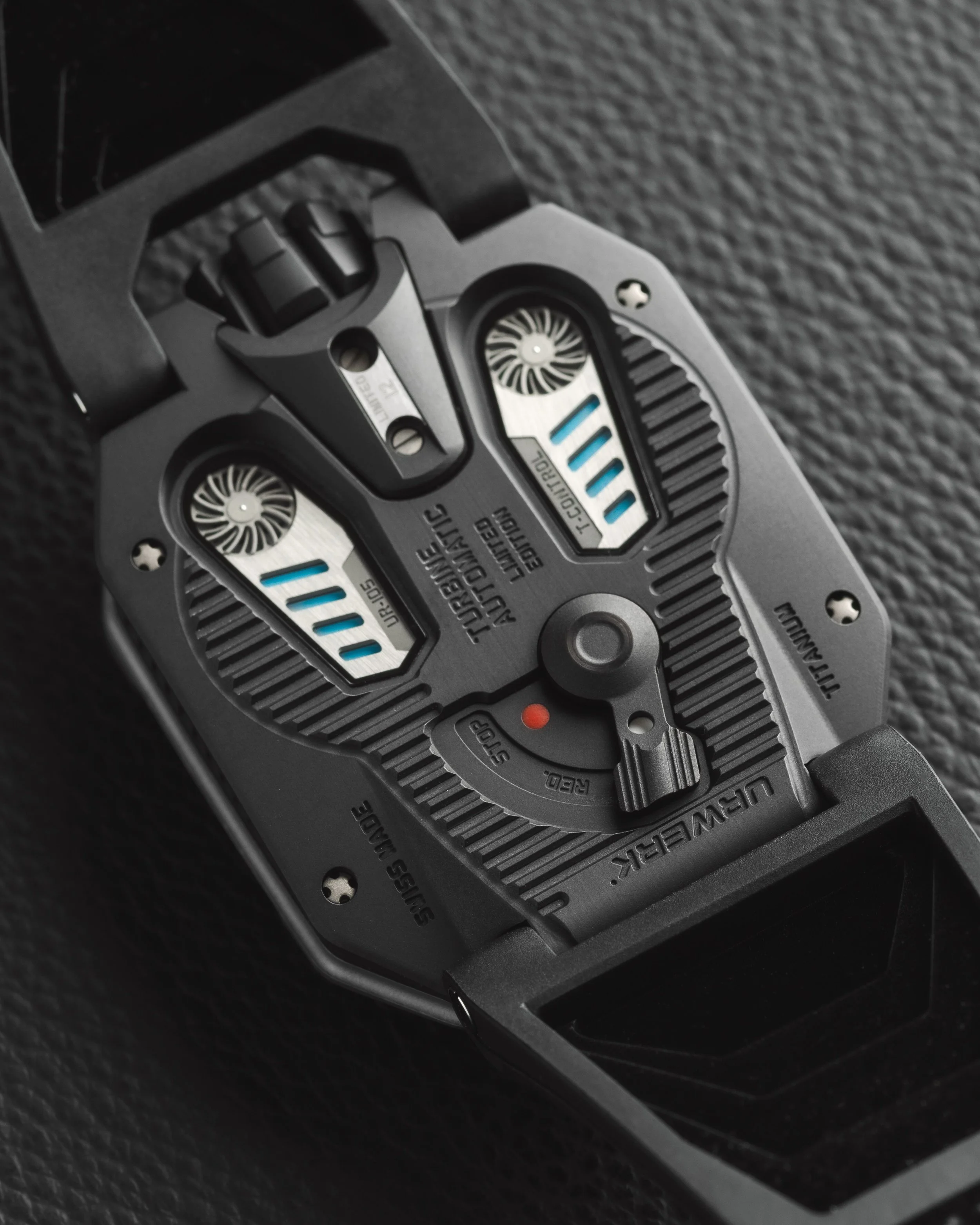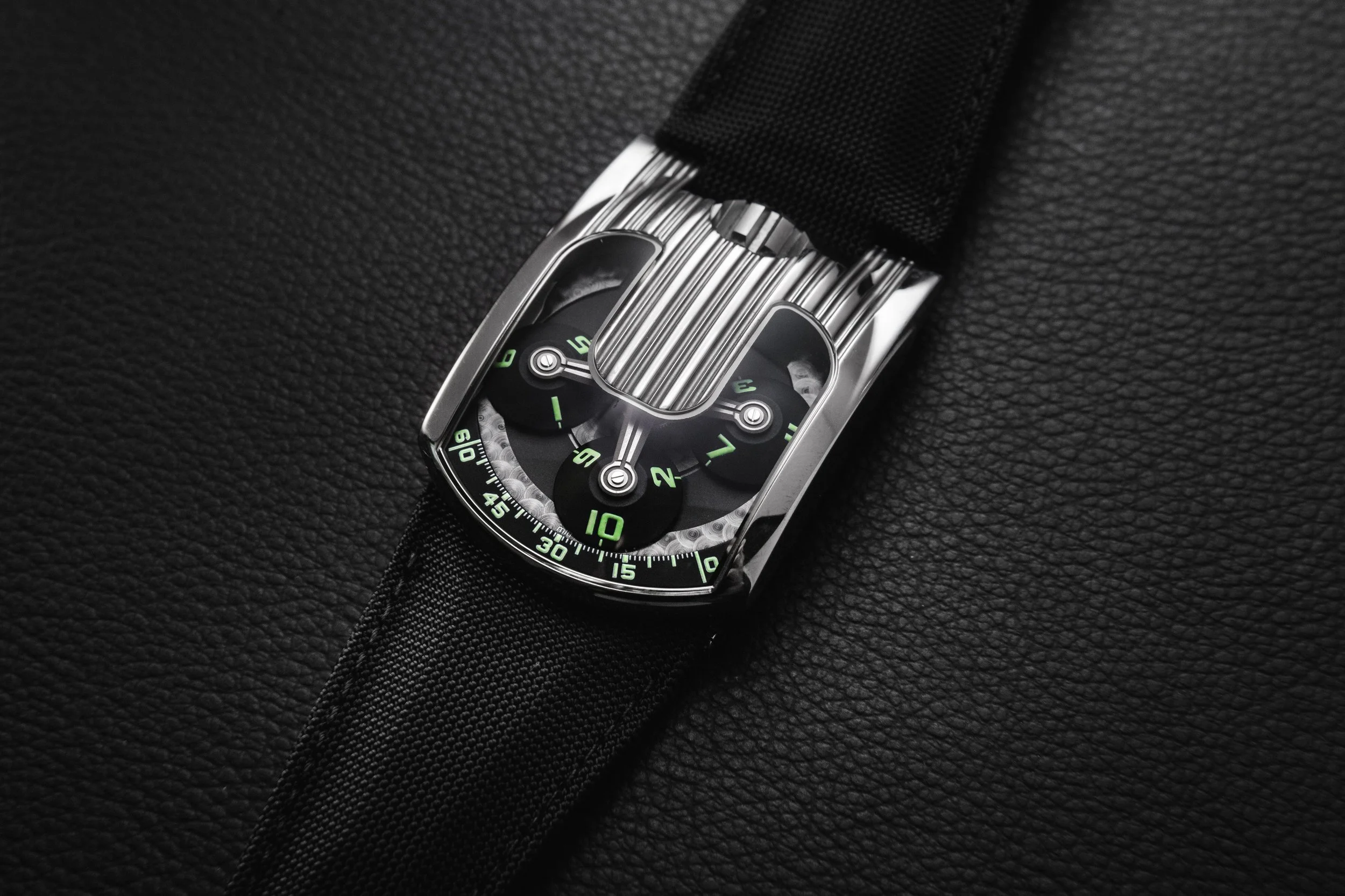 Between the pursuit of better “armor” and surprising interactivity, the UR-105 CT is another shining example of Urwerk’s thematic pursuits. With CT models in the series, the duo introduced the “shield” – the adjustable cover that can be either closed or opened on the dial of the watch. Where such a shield is reminiscent of pocket watches and acts as a wonderful interactive experience, there is a much larger synthesis of the brand’s historical designs at play here. With all models leading up to the UR-105 CT, collectors were forced into either an open dial with the inner workings of the satellite hour exposed, as is the case in the UR-202,, or a closed dial with the classic miniature Han Solo spaceship aesthetic, found in the UR-101. The open/close shield on the UR-105 CT was a very intentional breaking of that open-closed binary.