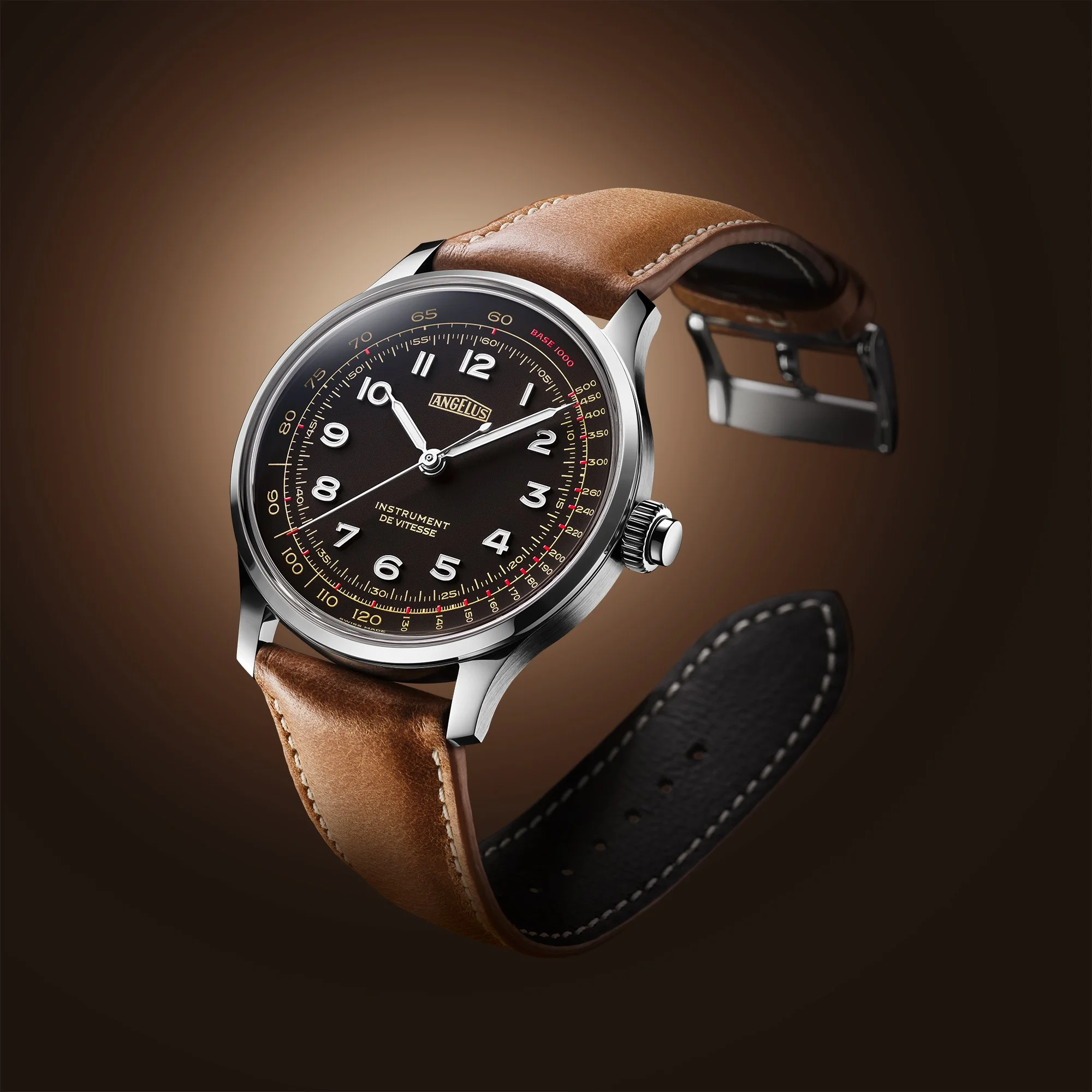 Functions: hours, minutes, one-minute chronograph, ‘base 1000’ tachymeter scale